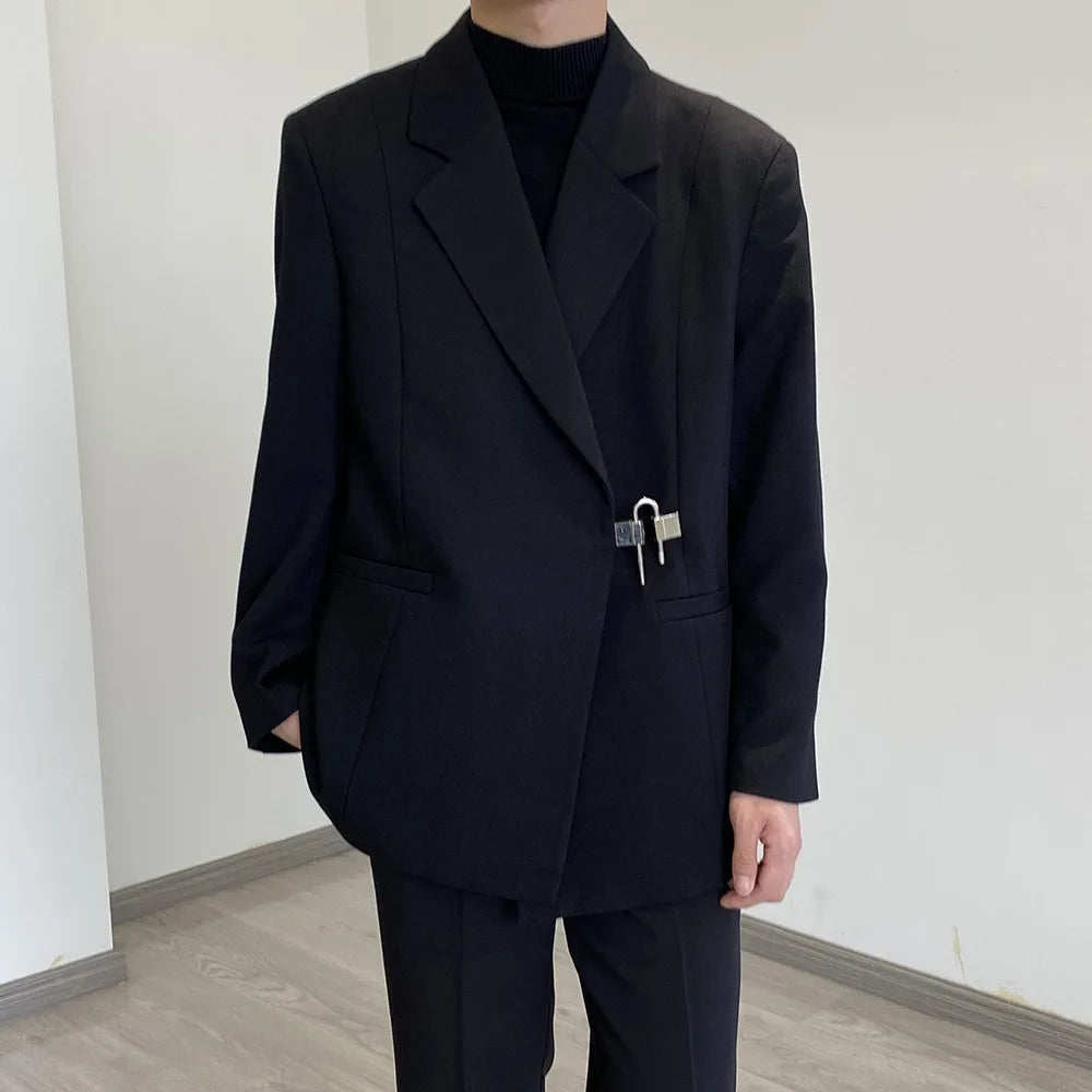 2026 Men's Korean Style Spring Casual Suit Jacekt Metal Buckle Male Loose Male Solid Color Blazers Harajuku Long Sleeve Coats