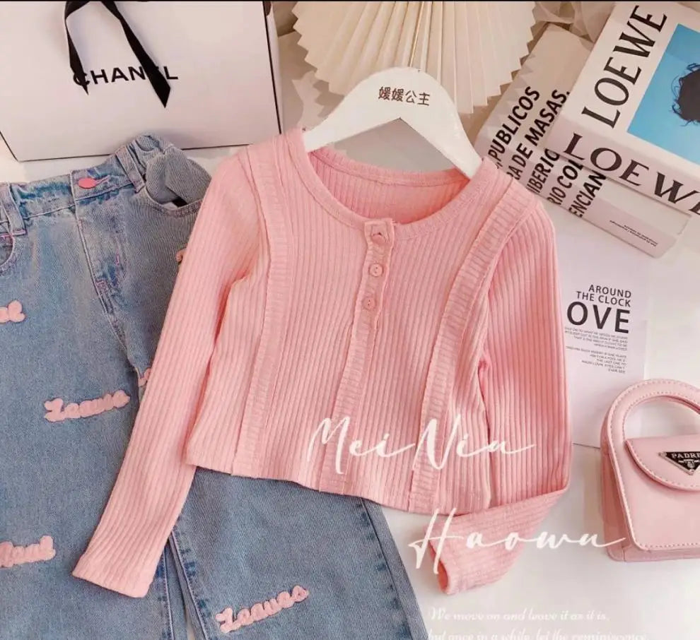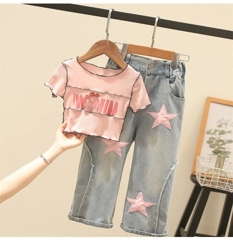 4-12 Years Teenger Girls Clothing Set Autumn Fashion Short Shirt + Letter Jeans 2Pcs Suit For Girl Children Birthday Present