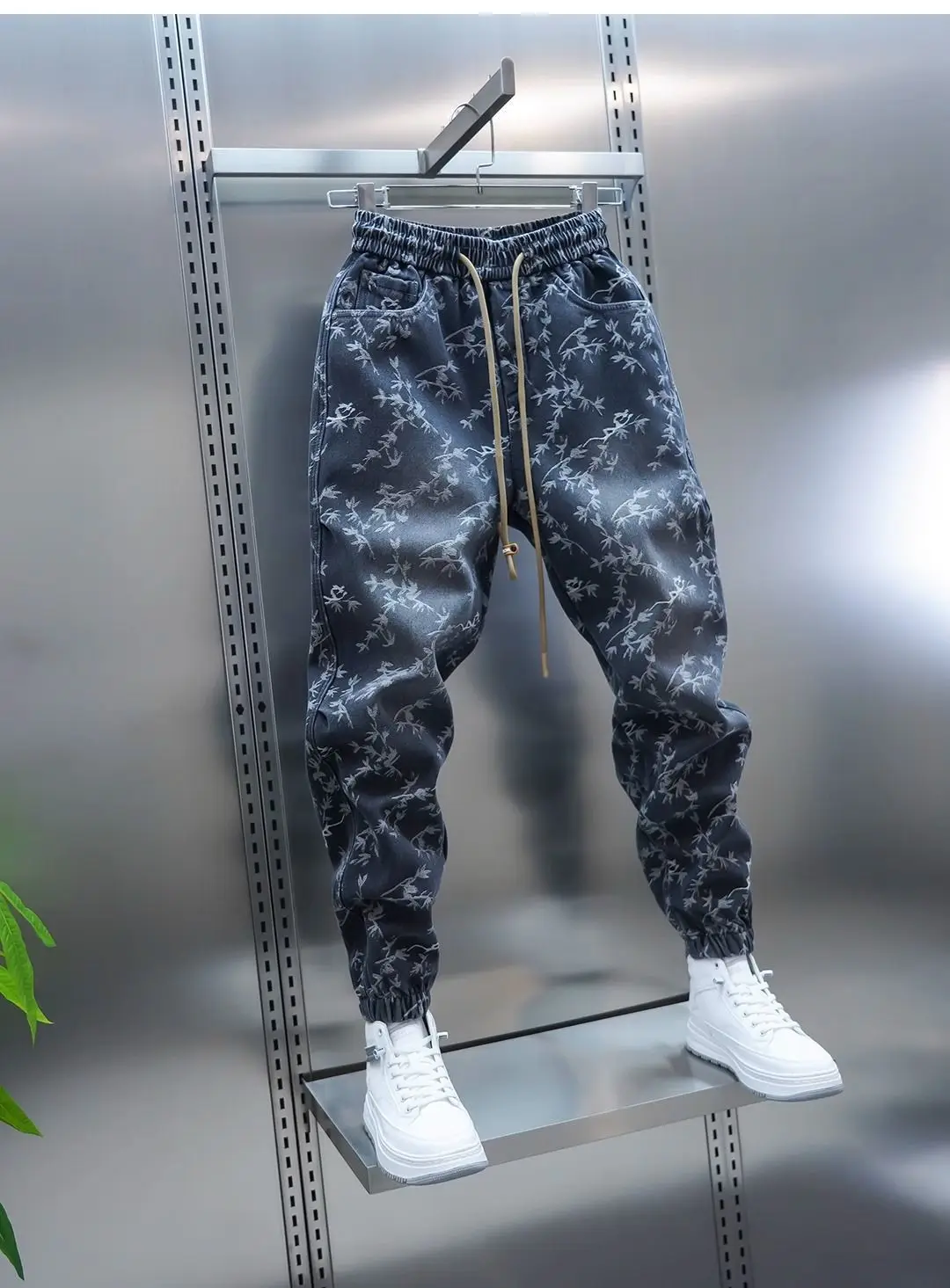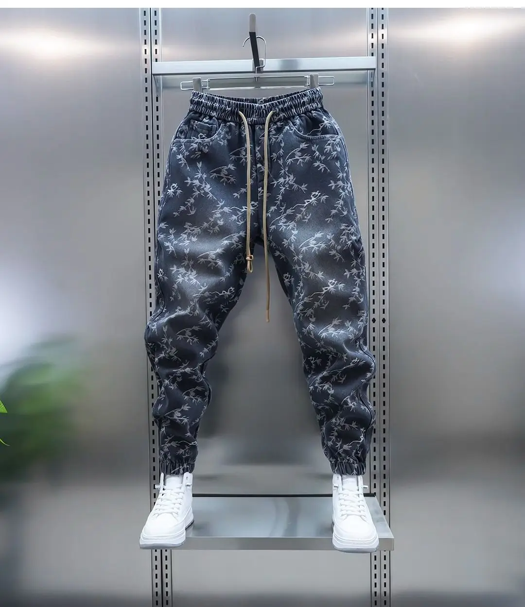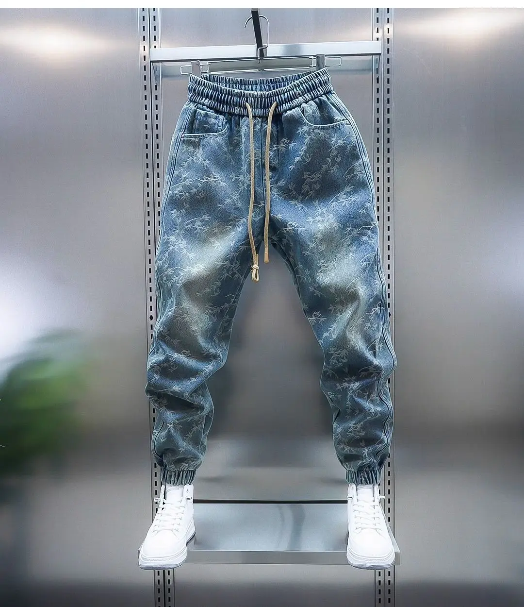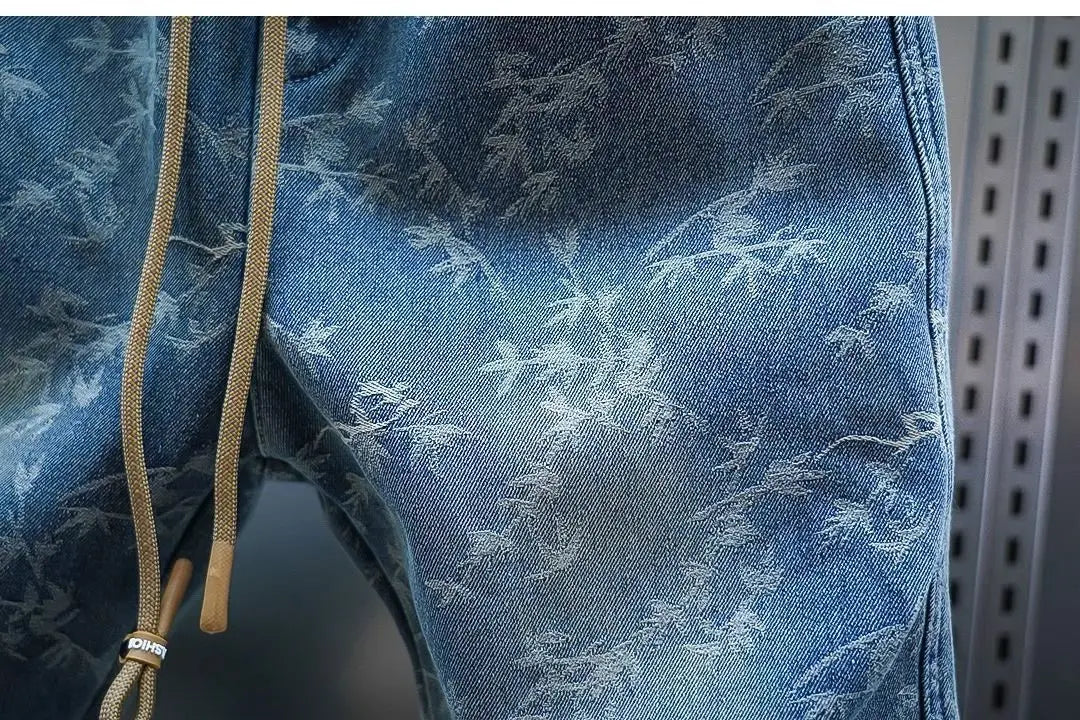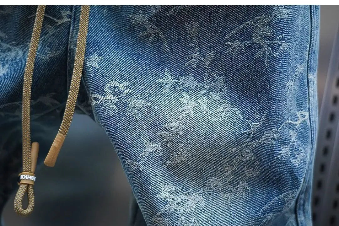 Trendy Men's Spring and Summer New Jeans Light Blue Heavy Industry Jacquard Leggings Thin Designer Luxury Elastic Waist Pants