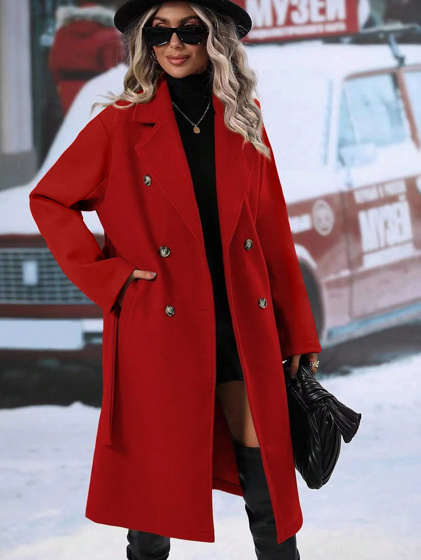 Women Turn Down Collar Thick Midi Length Wool Coat Pockets Casual Full Sleeve Double Breasted Blends Coats 2025 Autumn Winter