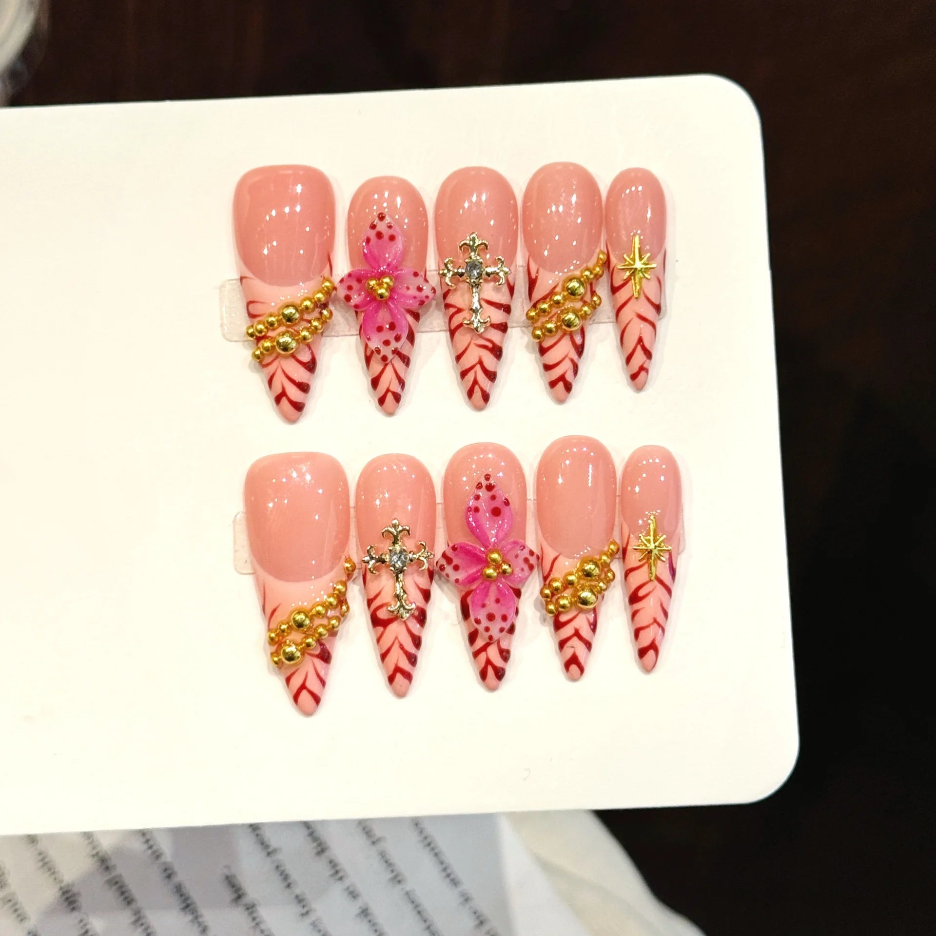 10Pcs Handmade Nails Set Press on Long Almond False Nail with Rhinestone Pink Camellia Design Reusable Full Cover Fake Nail Tips