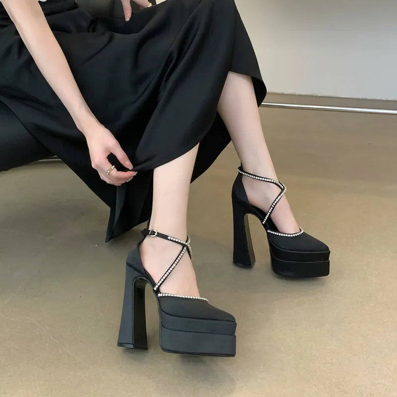 15cm Spring and Summer 2025 New Fashion Platform Thick Heels Hate Sky High Pointed Satin High Heels Show Women's Single Shoes