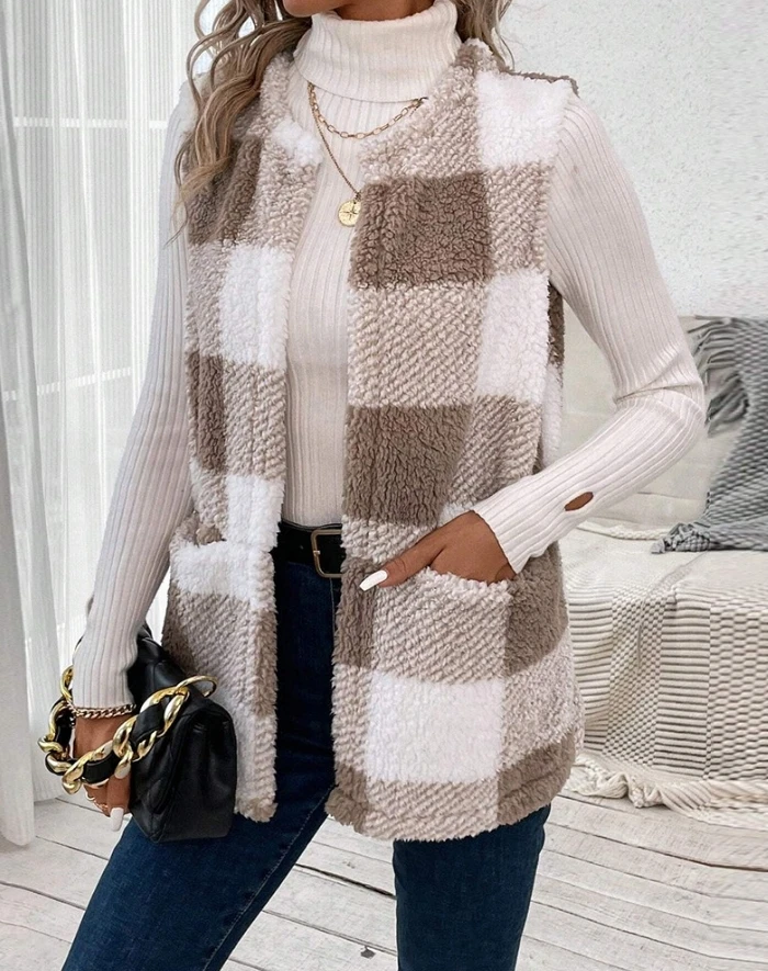 Autumn Women's Sleeveless Vest Cotton Coat Casual Women's Pocket Vest Fashionable Checkered Pattern Pocket Design Teddy Vest