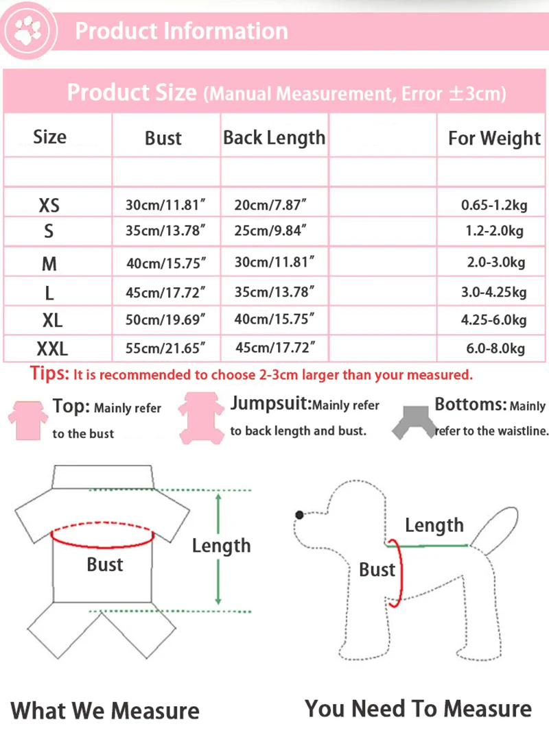 2. For the two legs Clothes , pls pay attention to chest girth, And for four legs, must fit for chest girth and back length.