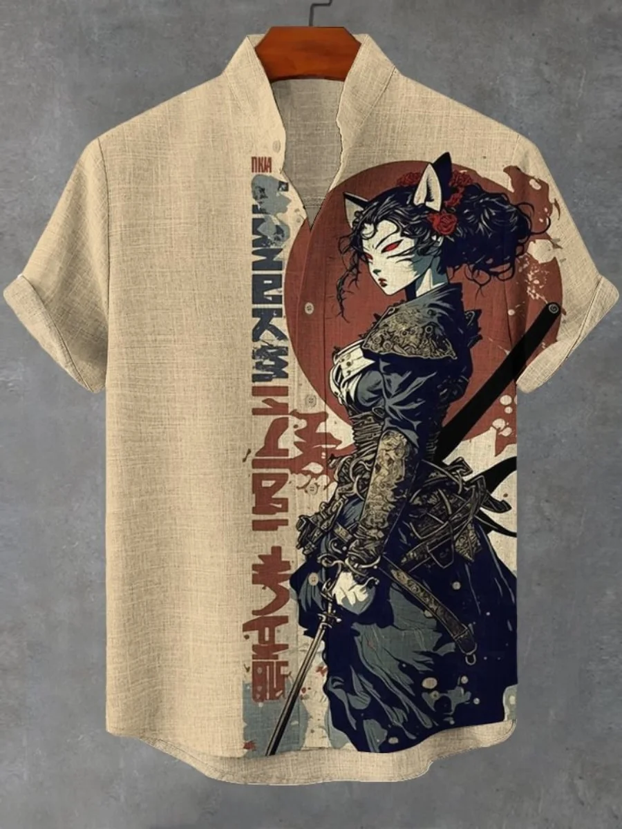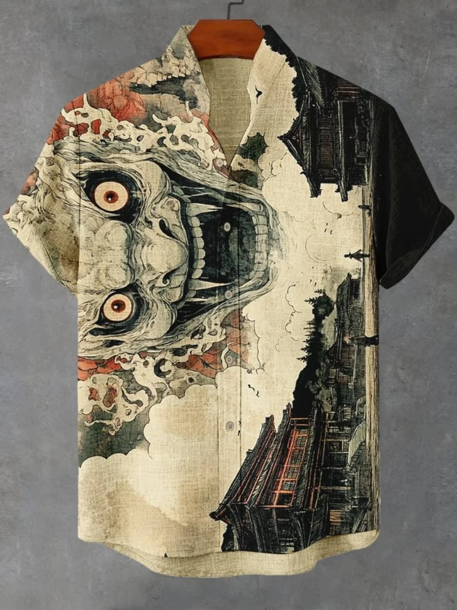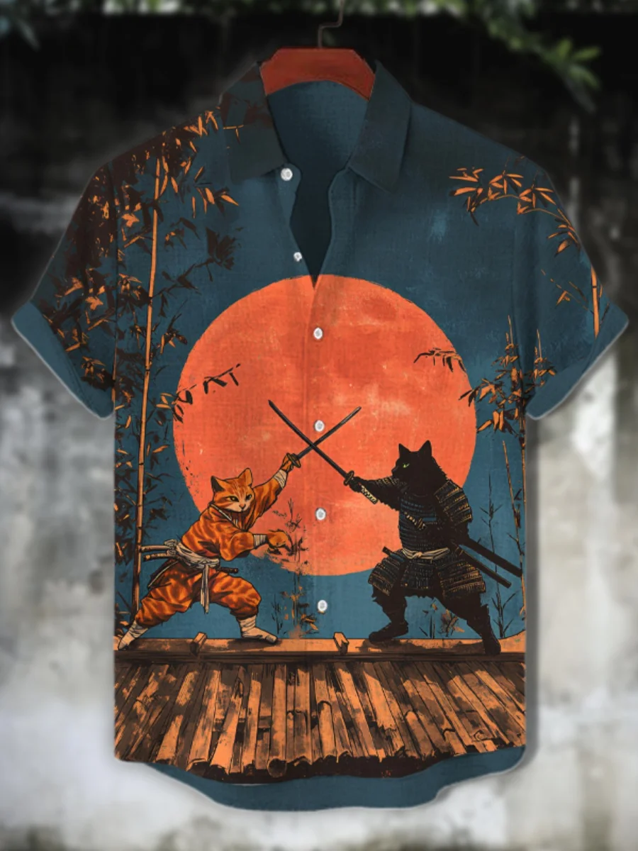 New cartoon cat-themed short-sleeved shirt, summer retro men's art print shirt, casual vacation streetwear
