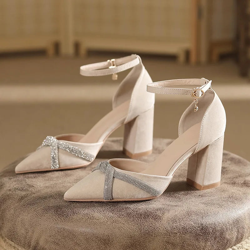 Size 30-44 Chunky Heel Hollow Point Toe High Heels Women Shoes Solid Color Ankle Strap Rhinestone Black Heels