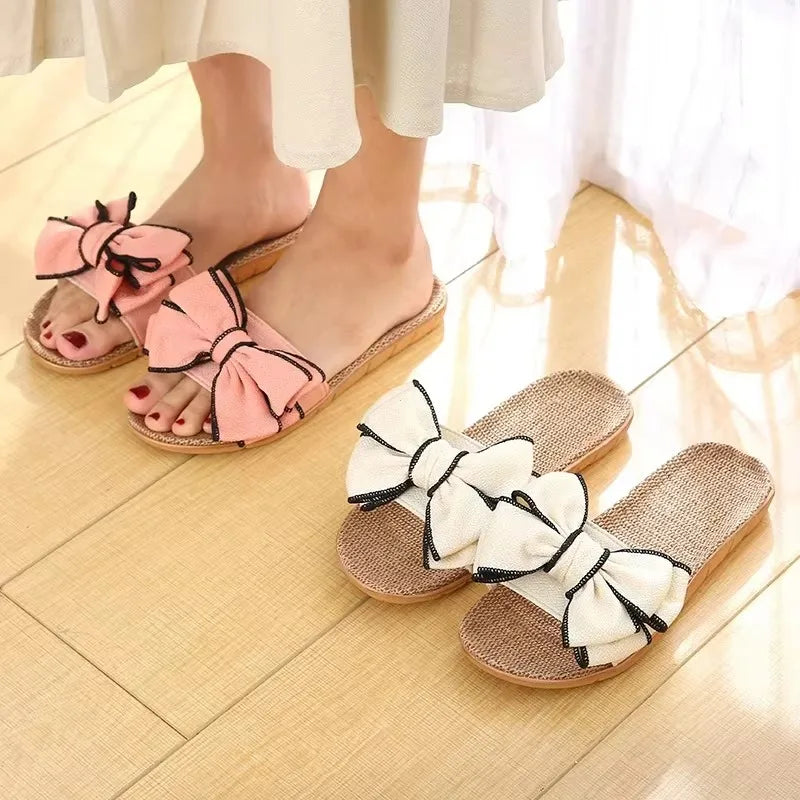 Women Summer Casual Slides Comfortable Flax Slippers Striped Bow Linen Flip Flops Platform Sandals Ladies Indoor Shoes slippers