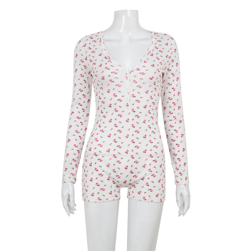 Y2K women's clothing, printed, color block, V-neck, buttons, high waist, slim fit, home wear, long sleeved jumpsuit with spots